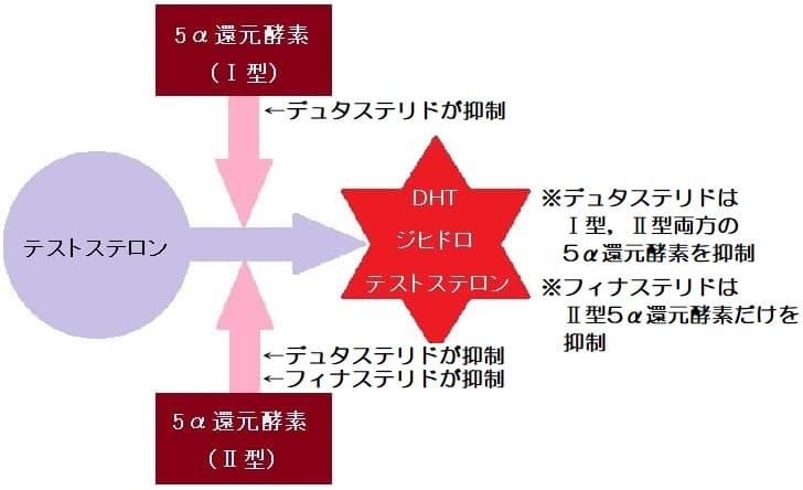 フィナステリドは,2種類の5α還元酵素のうちⅡ型のみを抑制します。デュタステリド(ザガーロ)は,Ⅱ型のみならずⅠ型も抑制します。