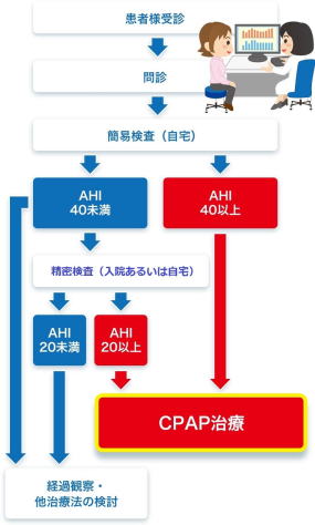 フローチャートの中の「AHI」,「CPAP治療」について簡単に解説します。