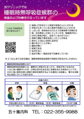 ※在宅PSG検査の場合,通常の(閉塞性)睡眠時無呼吸症候群については正しく診断できますが,それ以外の睡眠関連疾患(周期性四肢運動障害,むずむず脚症候群,ナルコレプシーなど)については診断が不正確になるおそれがあります。その場合は当クリニックから精密検査を行なえる適切な医療機関をご紹介しております。